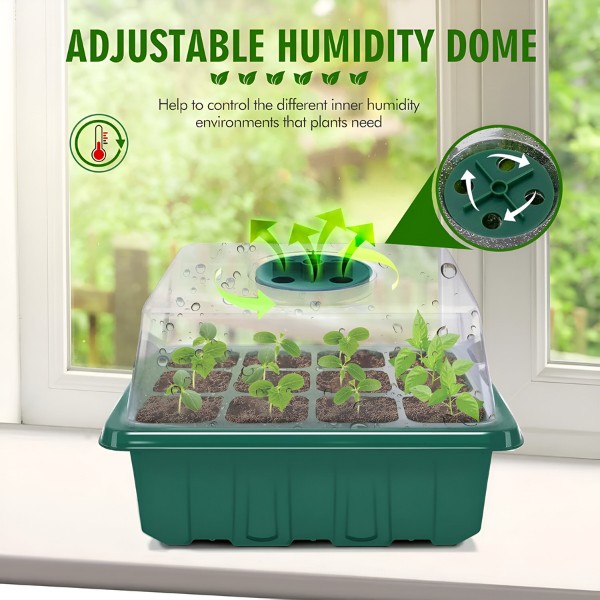 Vsak pladenj ima 12 lukenj in pokrov s stikalom za prezračevanje. Zdaj lahko nadzorujete raven vlažnosti in zagotovite najboljše okolje za vaše sadike. Gojite zdrave, dobro prezračene korenine za močnejše rastline.